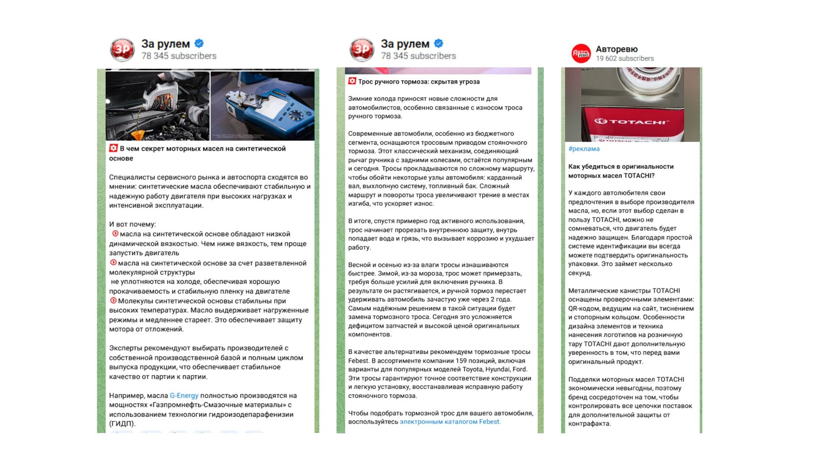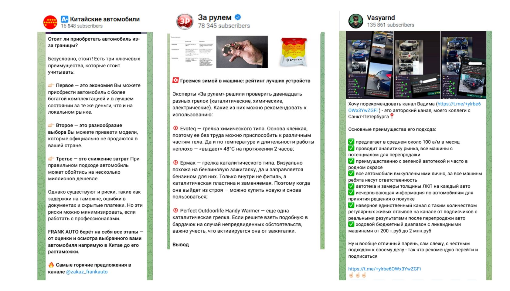 Машина, аксессуар, автозапчасть, например, диск или шина, хорошо встраиваются в советы типа «что взять в дорогу на дальнюю дистанцию», подборки «ТОП грелок для авто». Такой пост в Tg подписчик воспринимает как рекомендацию. Текст не выглядит как прямая реклама, а значит человек вероятнее задумается, чтобы приобрести автомобиль, услугу и т.д.