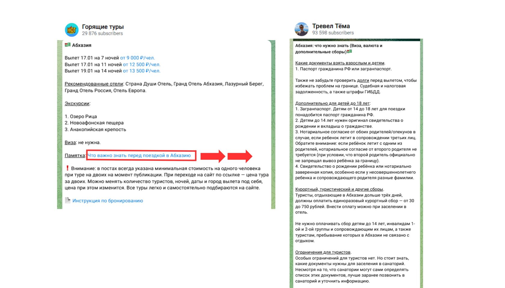 Или вот, например, как рекламируется канал «Тревел Тёма». Размещается ссылка в канале про горящие туры с полезной памяткой, которая ведет на его блог.