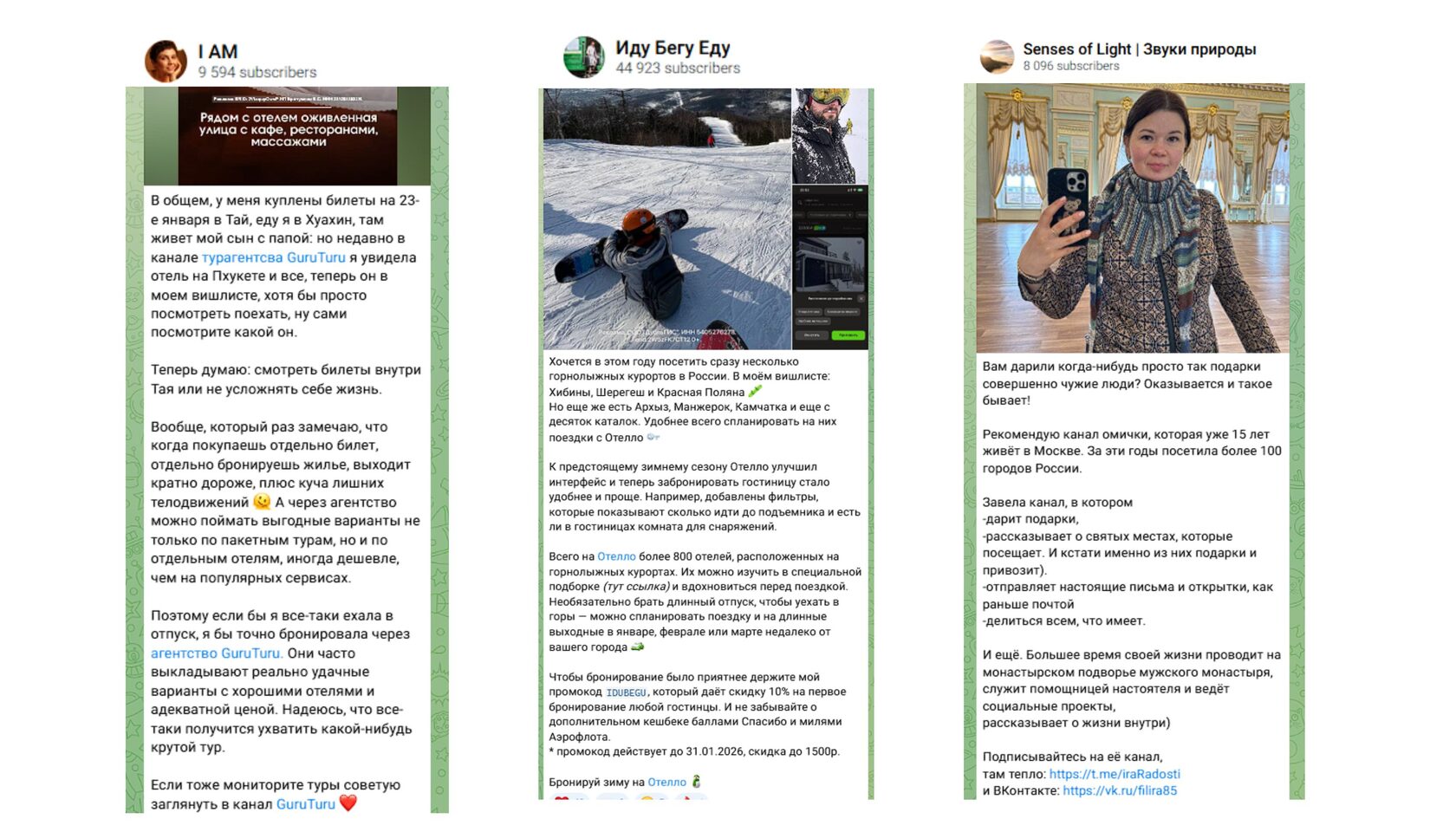 Например, вы заказываете продвижение у лидера мнений. Блогер не пишет в канал прямо: «Это лучший экскурсионный сервис!», а подробно рассказывает «Я долго думал, где отдыхать в этом году, мне здорово помогла определиться турфирма X». Далее автор может описать свое путешествие и дать ссылку. Для аудитории это реклама, похожая на совет. Так могут продвигаться туроператор, турблогер, авторское агентство, а также мероприятия: развлекательный фестиваль, новый концерт и т.д.