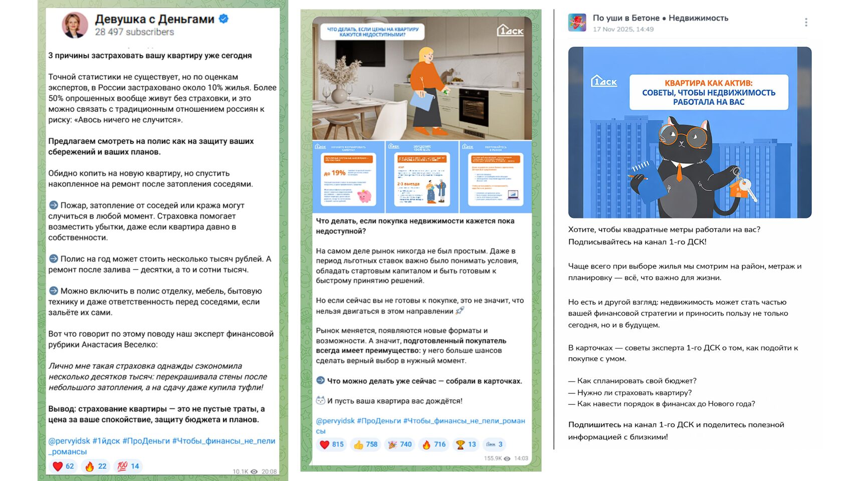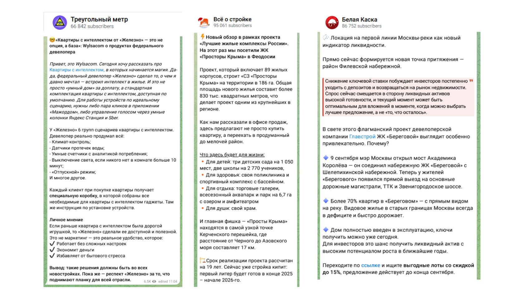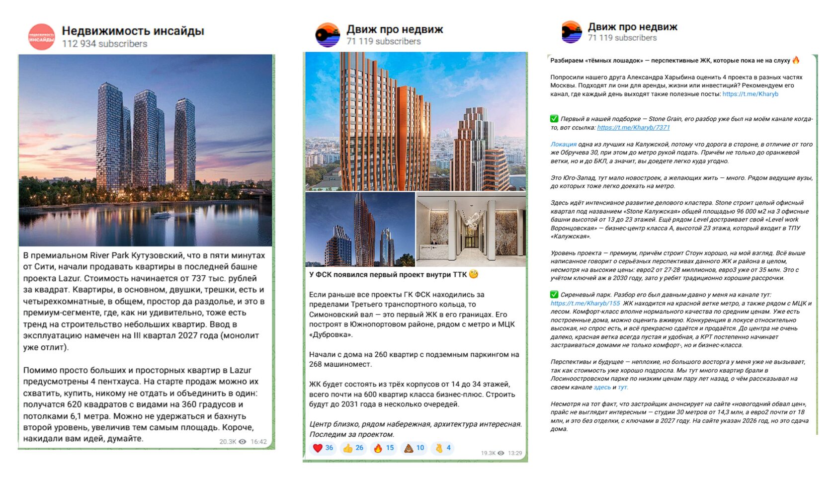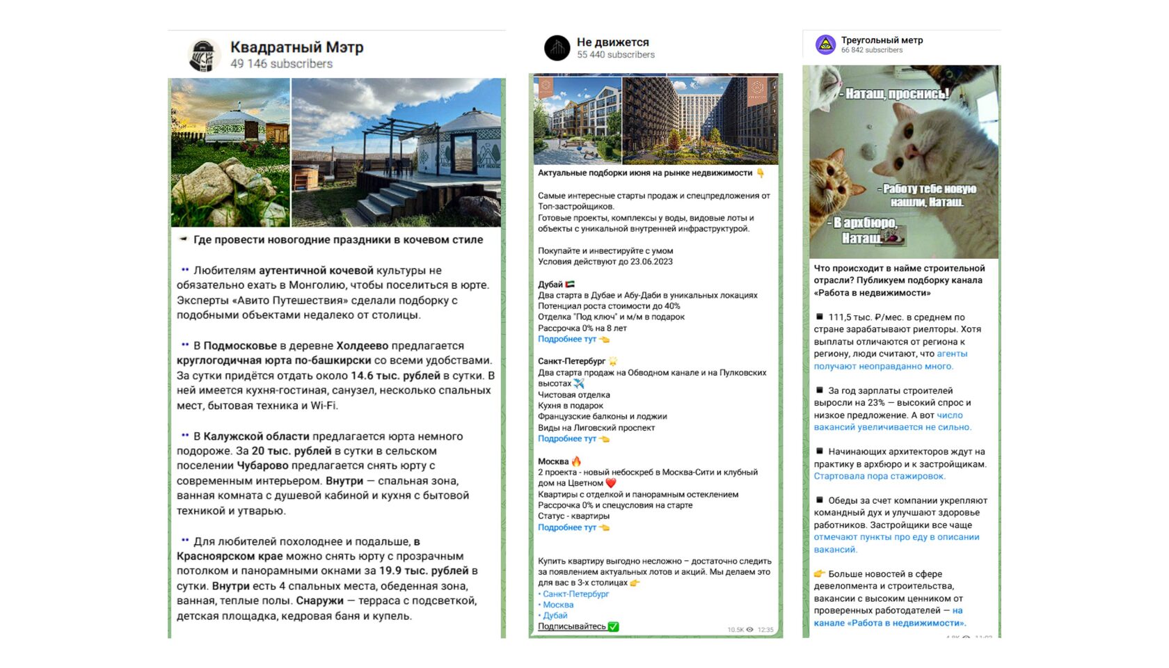 1) Специфика. Квартира или дом, вторичка или новостройка, переезд в коттеджный поселок или в шумный центр города — это непростое решение. Прежде чем решиться на покупку или аренду, человек сравнивает локации, изучает аналитику. И ТГ подходит для этого: люди читают описания районов, следят за работой застройщиков, оценивают ЖК. В то время как таргет дает минимум информации и работает зачастую так: «увидел — проскролил». Реклама может повлиять на человека, который готов покупать. Но не на того, кто только присматривается.