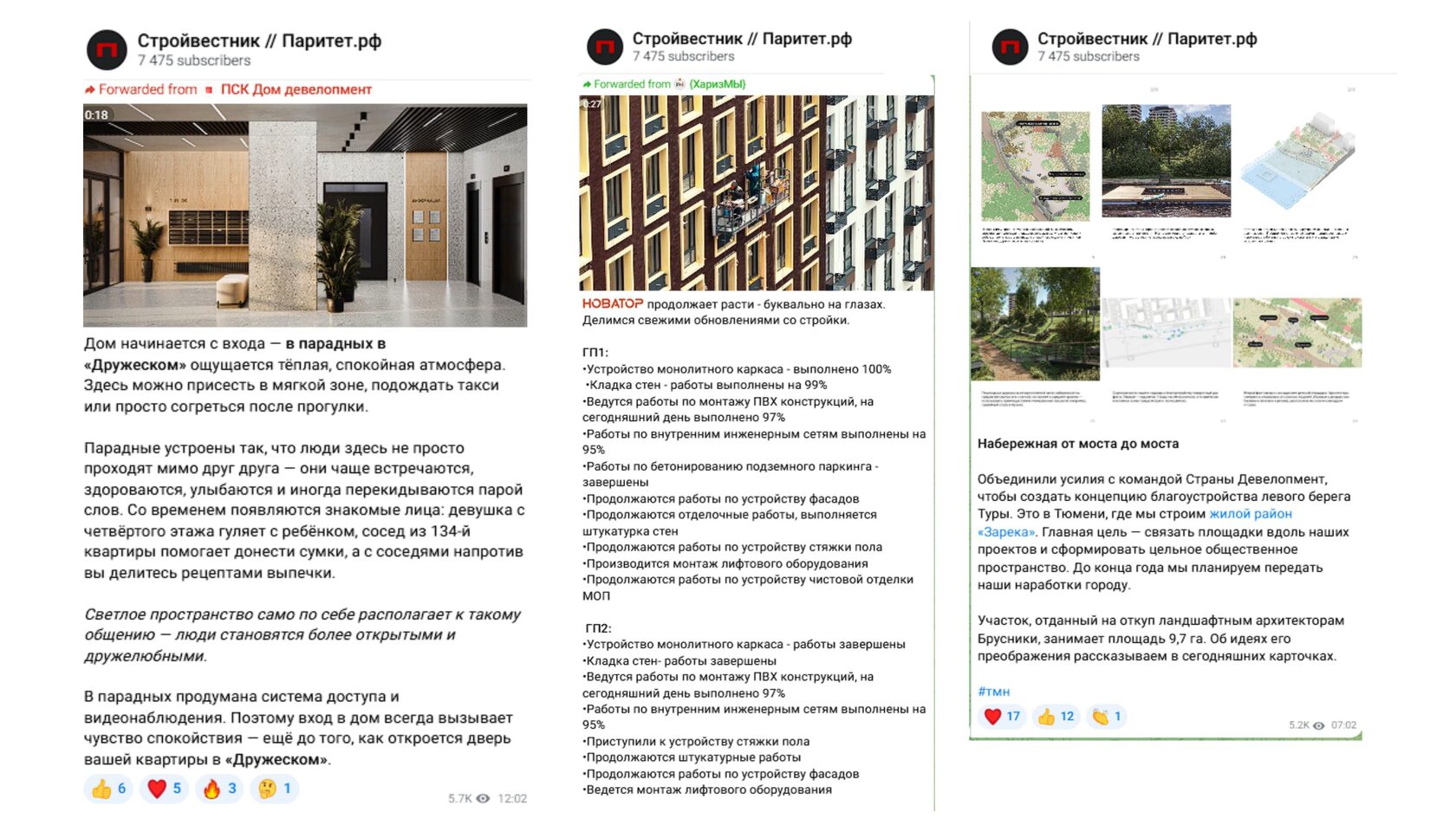 4) Живой контент. Маркетинг в недвижимости проигрывает без реальных покупателей. Такой контент сложно упаковать в таргеты. Зато в новостном канале можно развернуто показать истории счастливых новоселов или праздник для двора по случаю того, что застройщик ввел в эксплуатацию новый коммерческий объект.