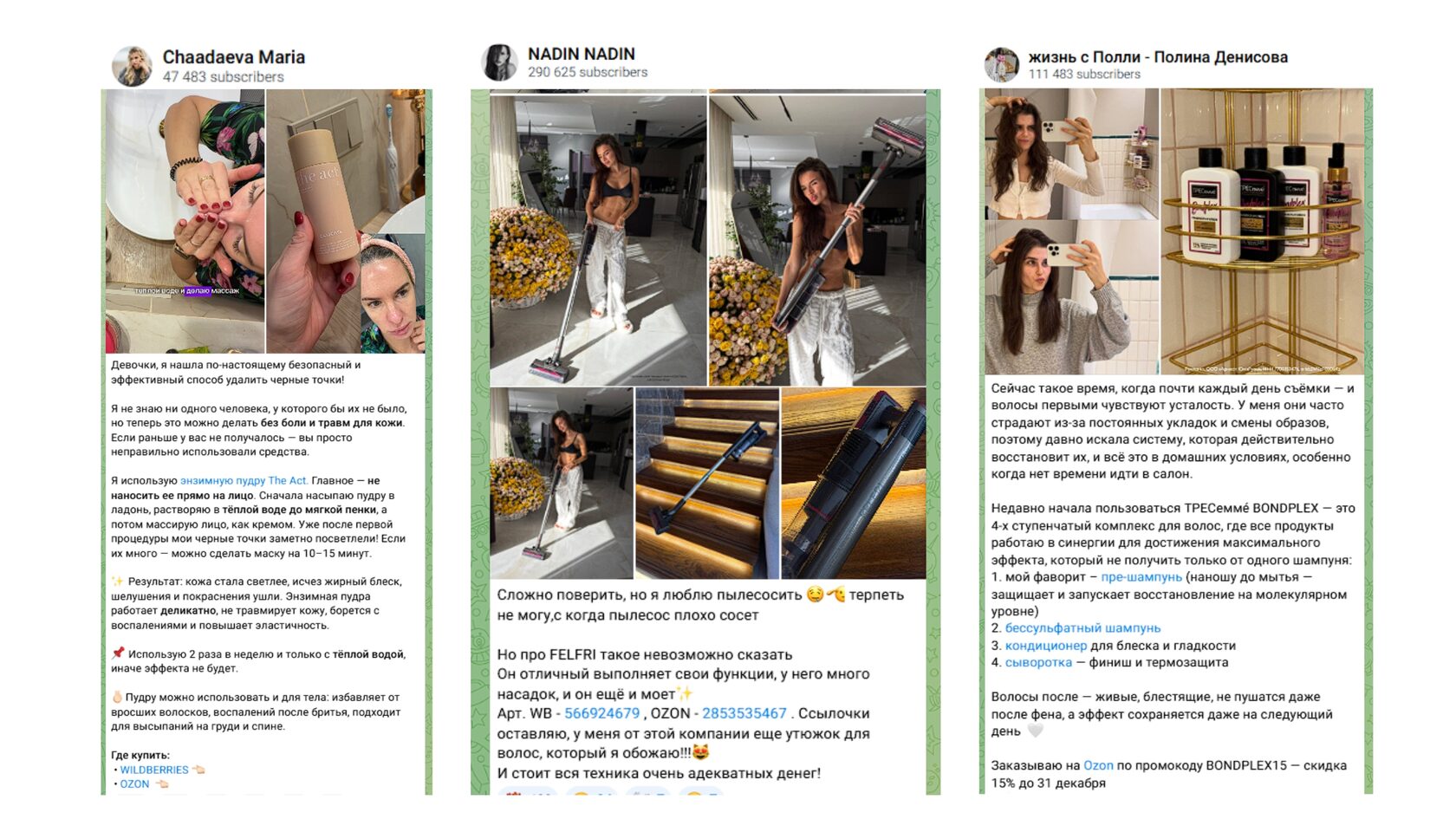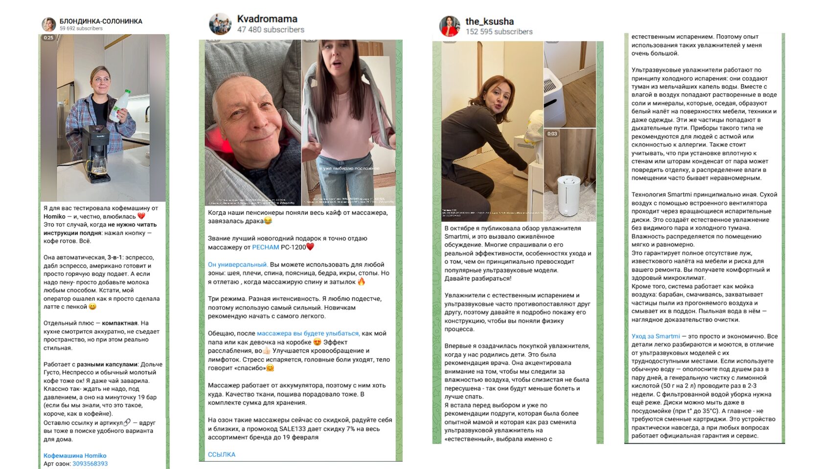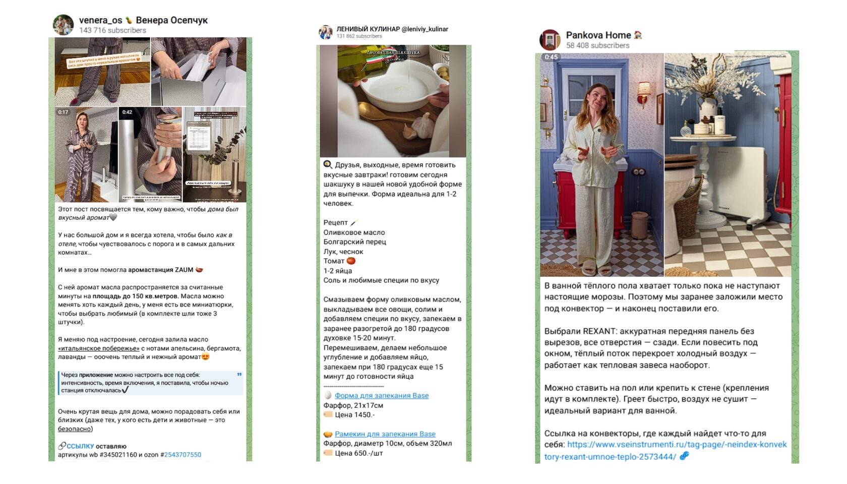 В массовом Telegram лучше всего работают форматы, которые выглядят как обычный контент канала, а не как реклама. Именно поэтому основным приёмом продвижения товаров для дома в 2026 году стал UGC-контент — рекомендации и обзоры от лица блогеров.