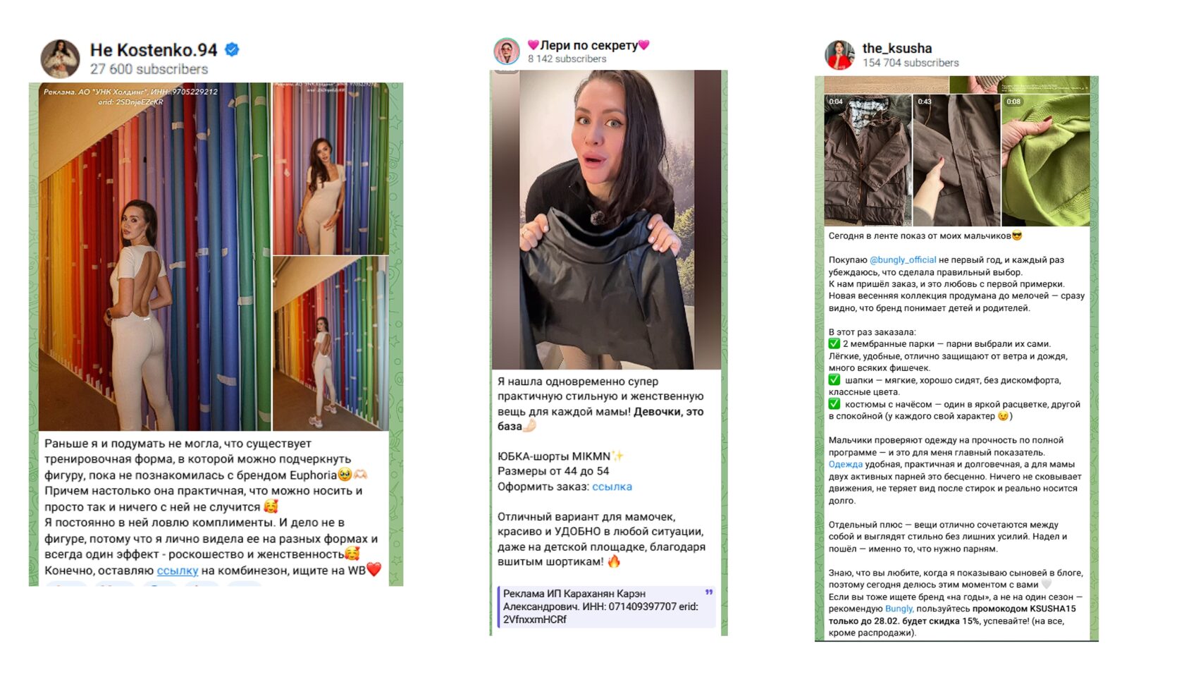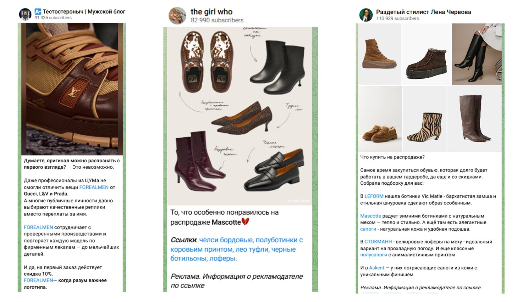 Это нативная реклама. Блогер в Тг не просто говорит «классная одежда и обувь» или «рекомендую хороший магазин N», а встраивает вещьаксессуар в свою жизнь. Например, делает селфи в зеркале или записывает видео, как сидит одежда или как смотрится обувькак сидит одежда или обувь. Подписчики видят материал, швы и посадку на человеке, а не просто каталог.